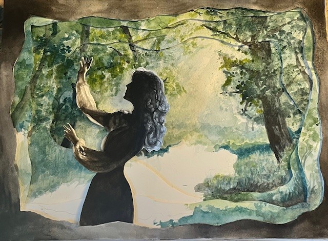 This project looks a bit different from what I've been doing in class last year. I've decided to move away from sculpture and do watercolor, which I tried during my home project last year. This piece is supposed to represent mother nature but my original idea was to have her holding a string, appearing to have "hung the moon". Instead, the moon is now hanging by her side and the string is attached to the sun, as if she is switching them out. I really enjoyed making this piece and was pleasantly surprised by how well it ended up looking. I searched up a tutorial on water color foliage and I think that helped a lot. I also used great reference photos, which is not something I did with sculpture. Overall I think I would like to explore this media and idea further throughout this year.